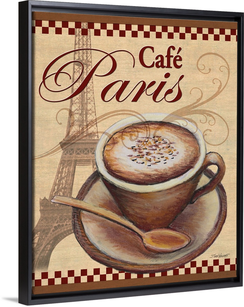 <p>Paris themed decor with an illustration of a cup of coffee with the Eiffel Tower in the background and "Cafe Paris" written in red on top.</p>
