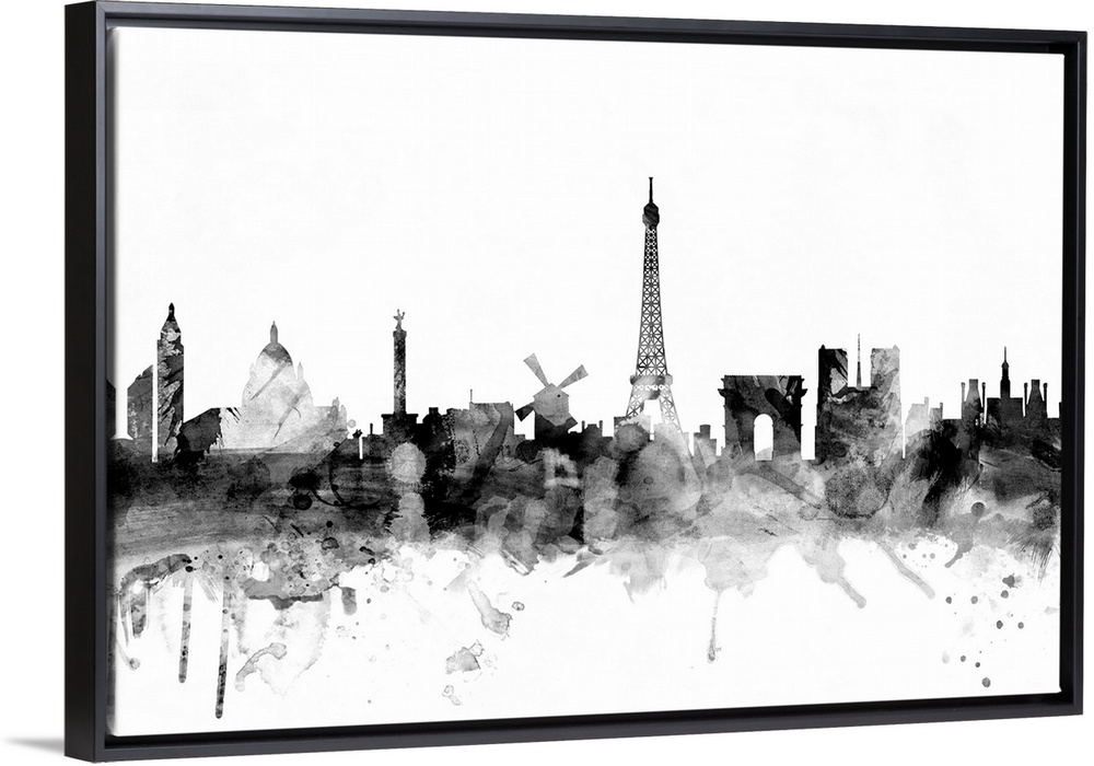 <p>Contemporary artwork of the Paris city skyline in black watercolor paint splashes.</p>