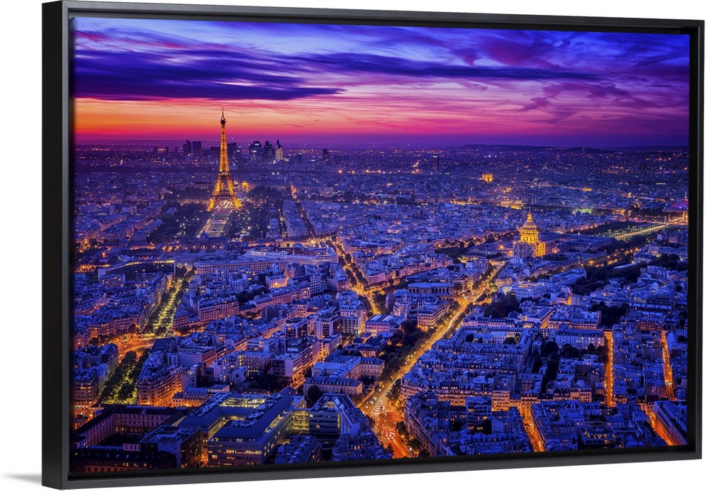 <p>A night view of Paris with the Eiffel Tower in the distance lit up.</p>