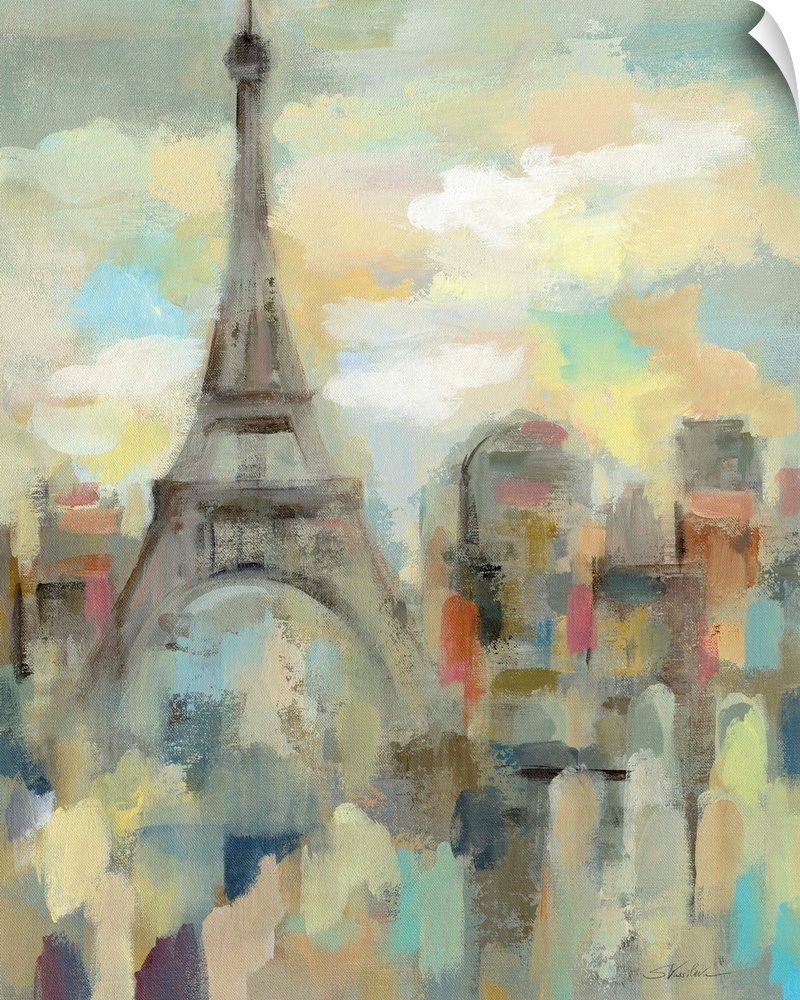 <p>Cityscape painting of Paris, France painted in an impressionistic style with the Eiffel Tower on the left.</p>