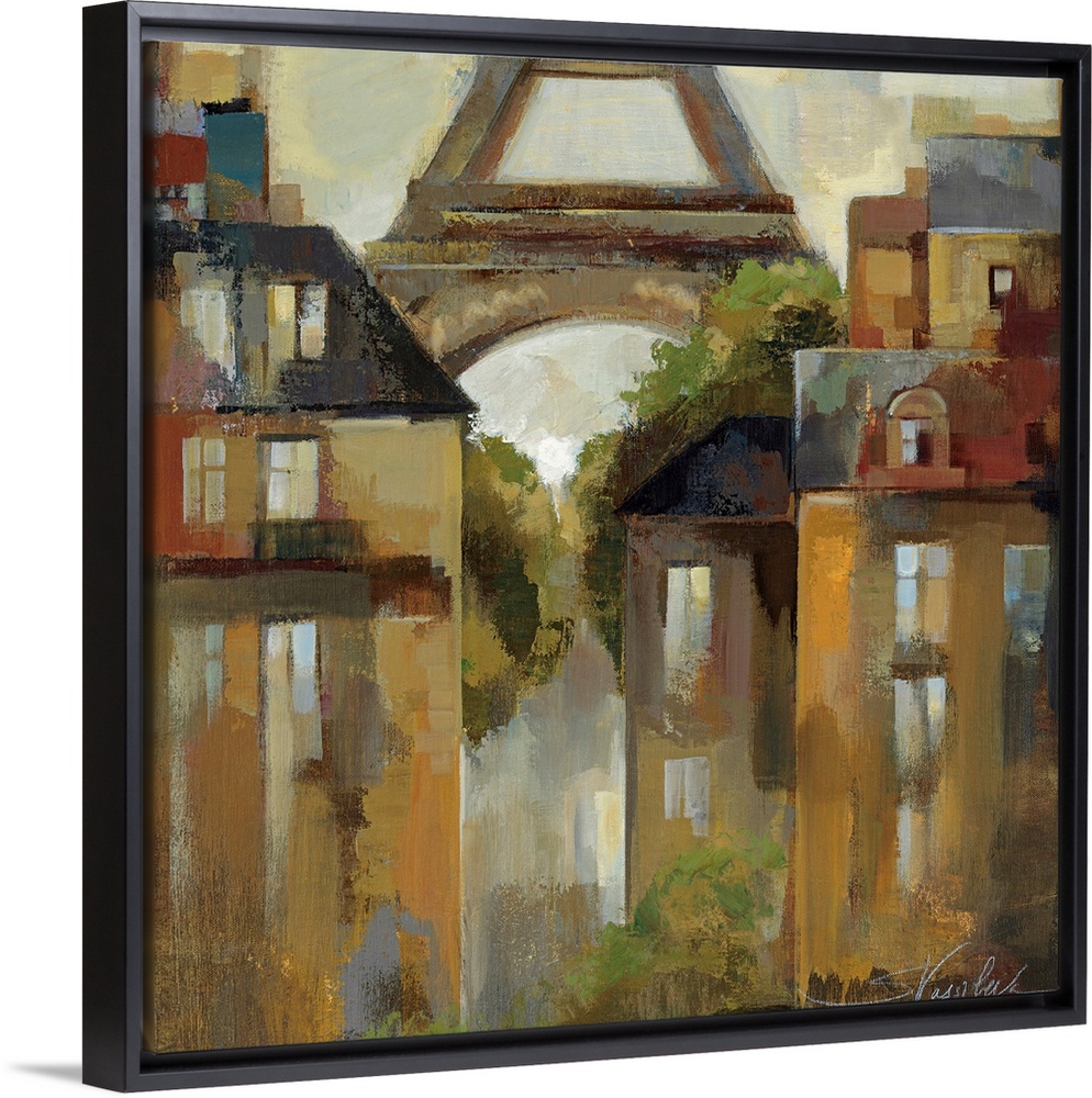 <p>Huge contemporary art shows a set of buildings and trees sitting in front of the Eiffel Tower's base in France. Artist uses a combination of different earth tones to construct this piece.</p>