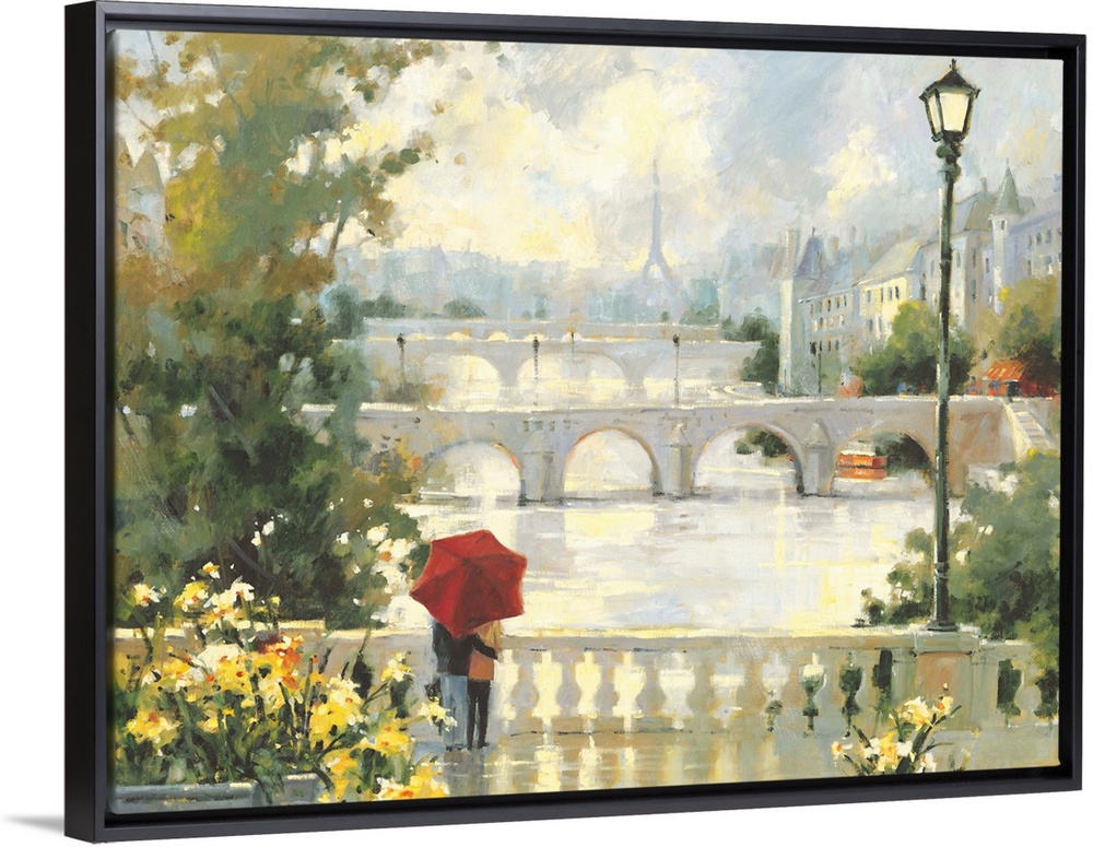 <p>Contemporary painting of an embracing couple standing under a red umbrella looking at the city.</p>