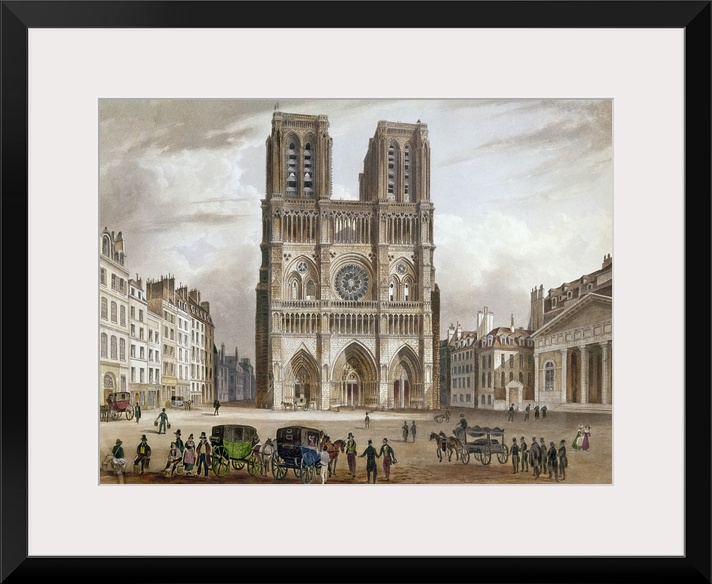 <p>View of the facade of Notre Dame Cathedral in Paris, France. Color line engraving, early 19th century.</p>