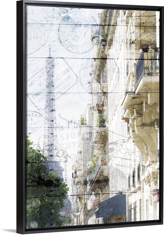 <p>Photograph of a Paris cityscape with buildings on the side and the Eiffel Tower in the background with a faint wood panel and postage stamp overlay.</p>