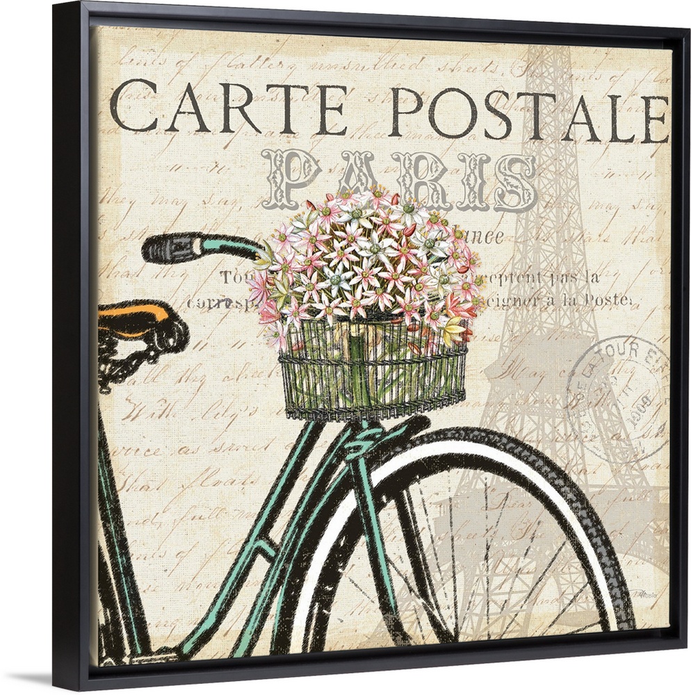 <p>Vintage image of a bicycle with a basket full of flowers on an antique Paris postcard.</p>