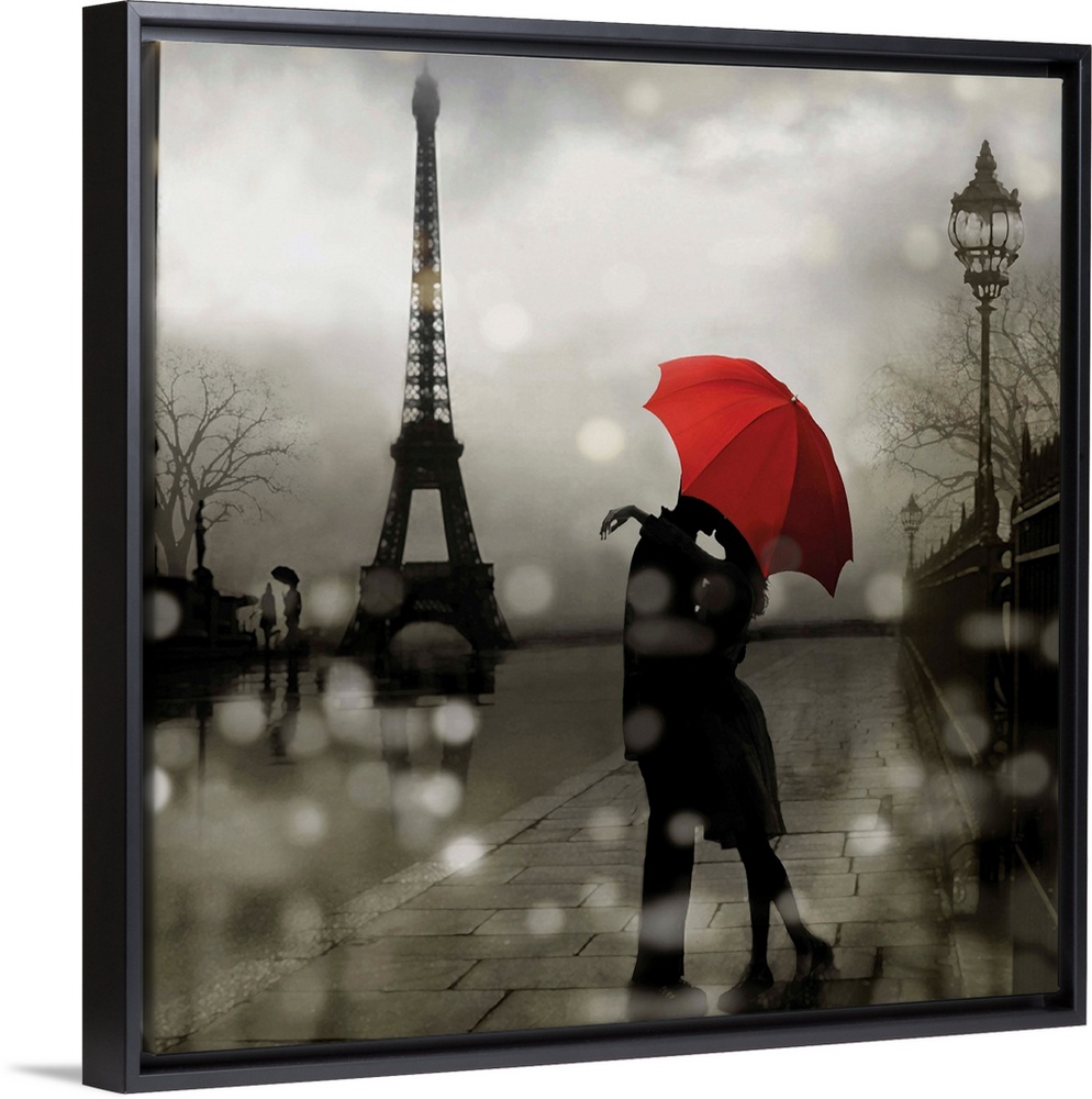 <p>Square illustration of a couple kissing under a red umbrella with the Eiffel Tower in the background and bokeh lights in the foreground.</p>