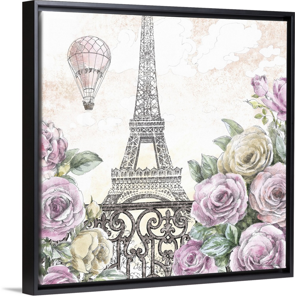 <p>Contemporary home decor artwork of the Eiffel Tower in a neutral pencil sketch-like style seen from a balcony with colorful roses.</p>