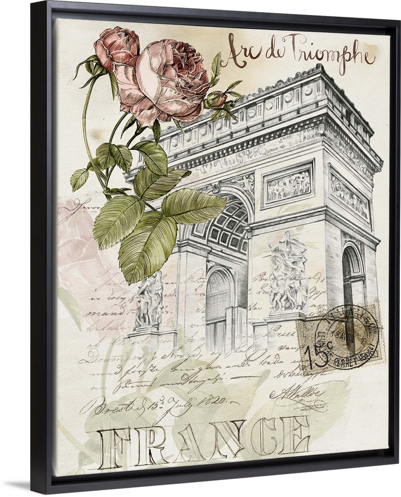 <p>A sketch of the Arc de Triomphe is adorned with an illustrated rose and French text throughout.</p>