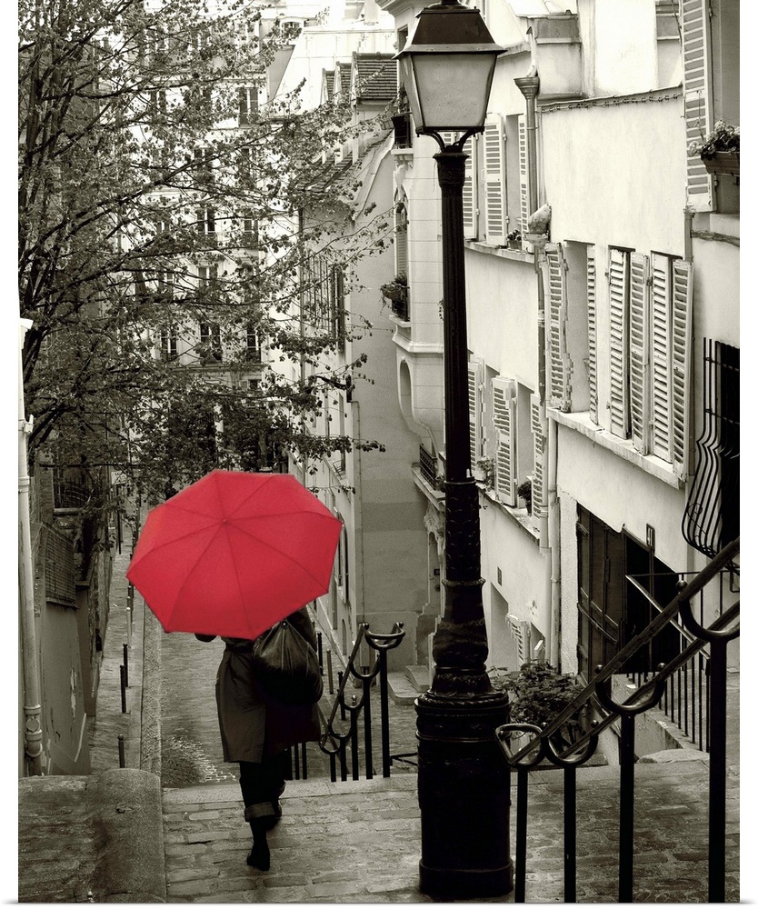 <p>A photograph of a person walking down an empty neighborhood corridor with a red umbrella overhead.</p>