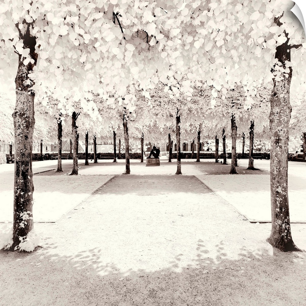 <p>It's a winter landscape with a statue between trees in the Tuileries garden in Paris. The trees have white leaves frosted by the cold.</p>