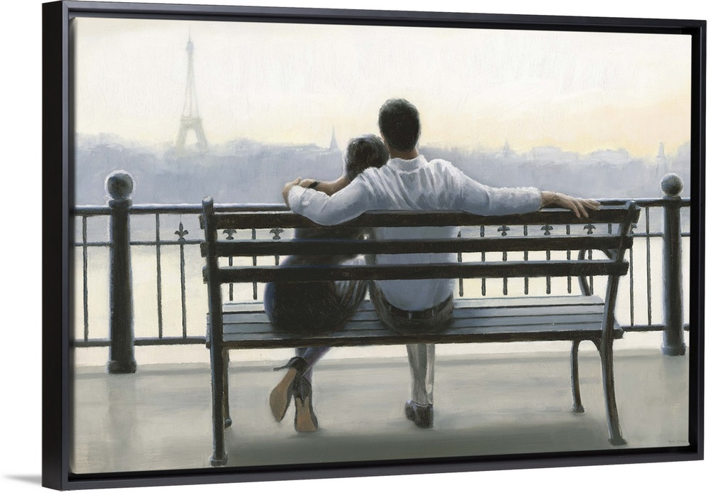 <p>Contemporary painting of a couple sitting on a park bench gazing at the Paris cityscape.</p>