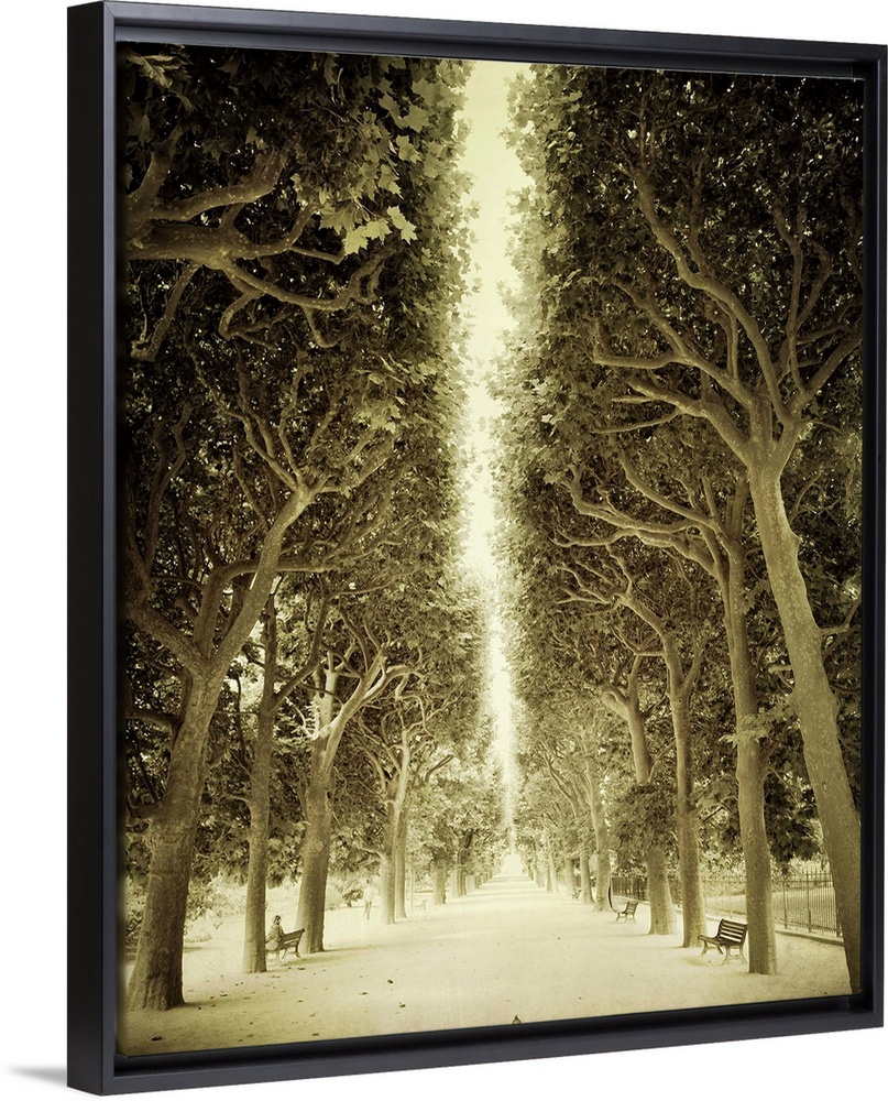 <p>Sepia toned photograph of the alley of trees in front of the Jardin des Plantes in Paris, France.</p>