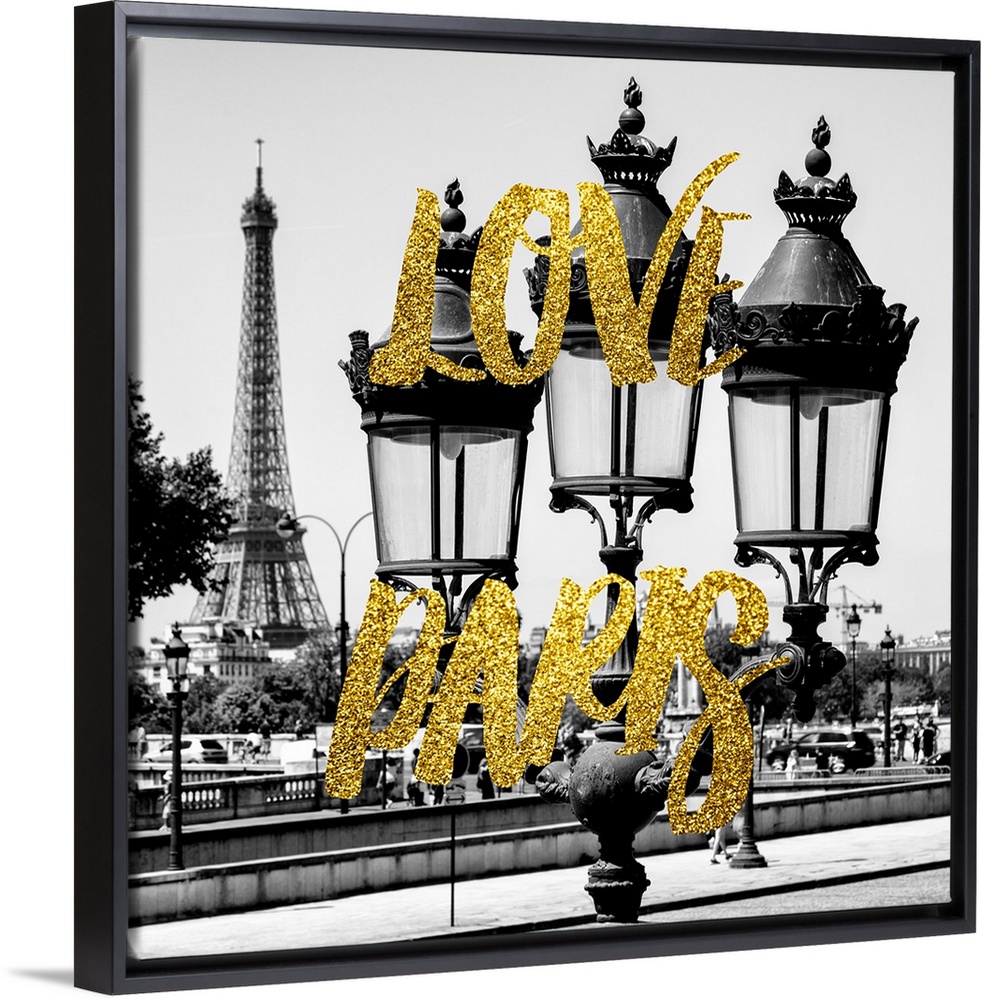 <p>Black and white photograph of a lamppost with the Eiffel Tower in the background and the phrase "Love Paris" written in gold glitter on top. From the Paris Fashion Series.</p>