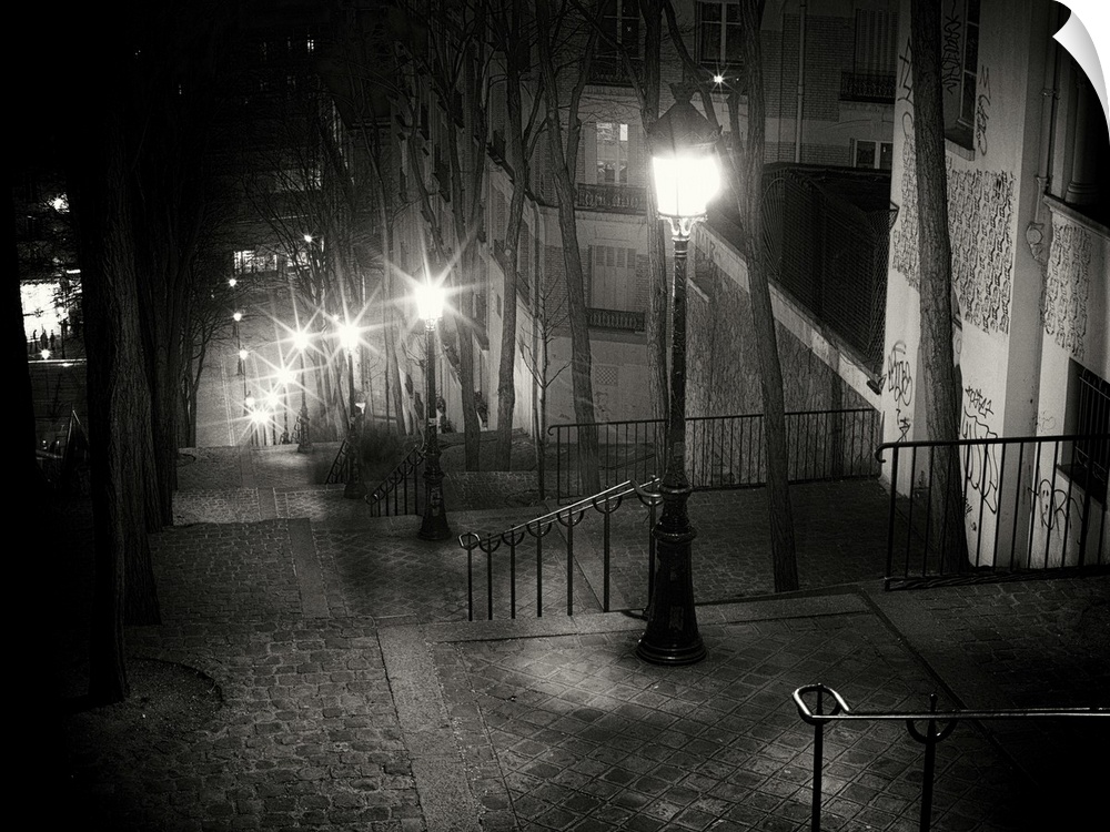<p>Steps on Parisian street at night with glowing street lamps</p>