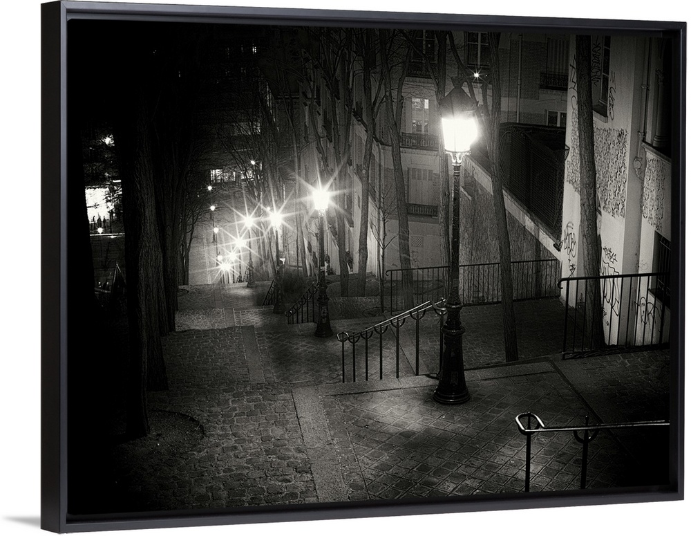 <p>Steps on Parisian street at night with glowing street lamps</p>