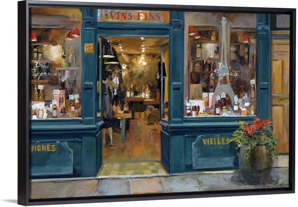 <p>This home docor painting for the living room or kitchen shows the interior of a shop as view from the front door and the street.</p>