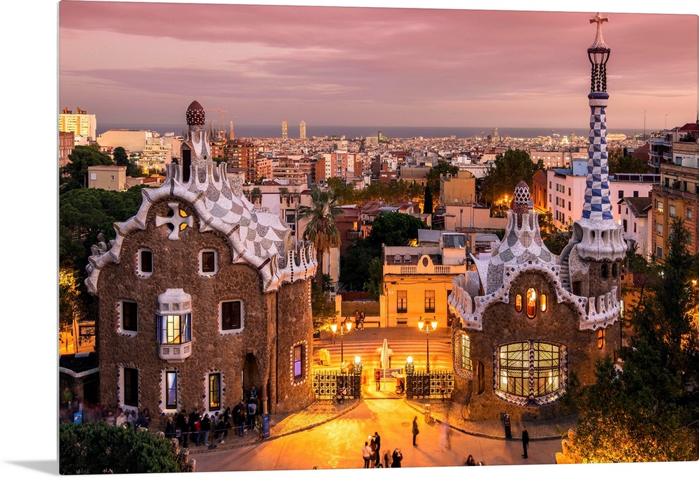 <p>Park Guell with city skyline behind at dusk, Barcelona, Catalonia, Spain.</p>