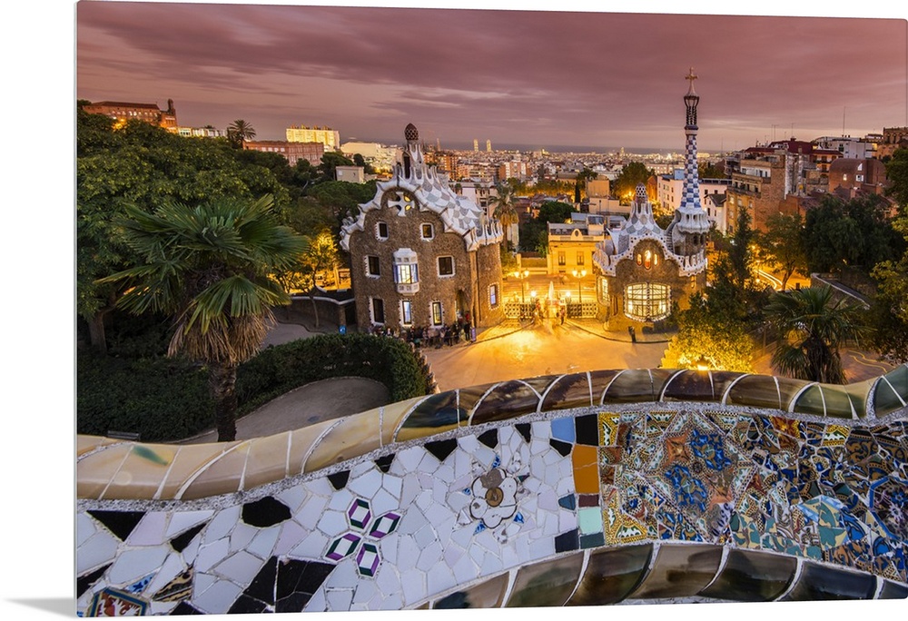 <p>Park Guell with city skyline behind at dusk, Barcelona, Catalonia, Spain.</p>