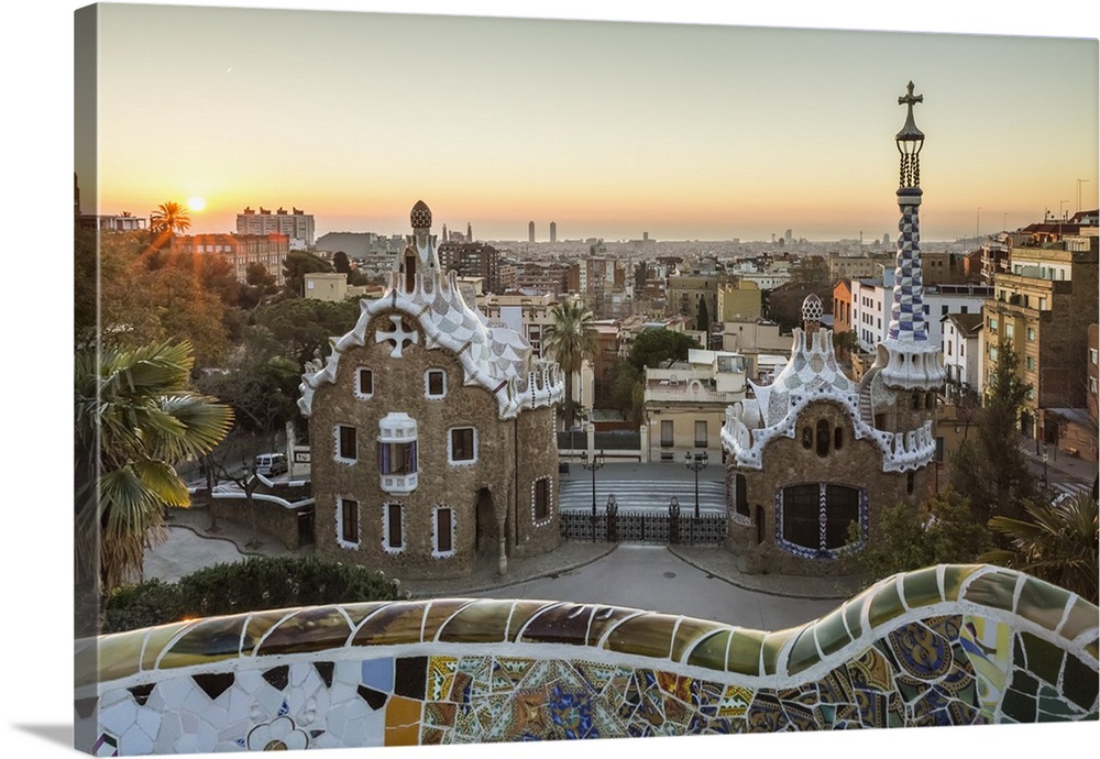 <p>Park Guell with city skyline behind at sunrise, Barcelona, Catalonia, Spain.</p>