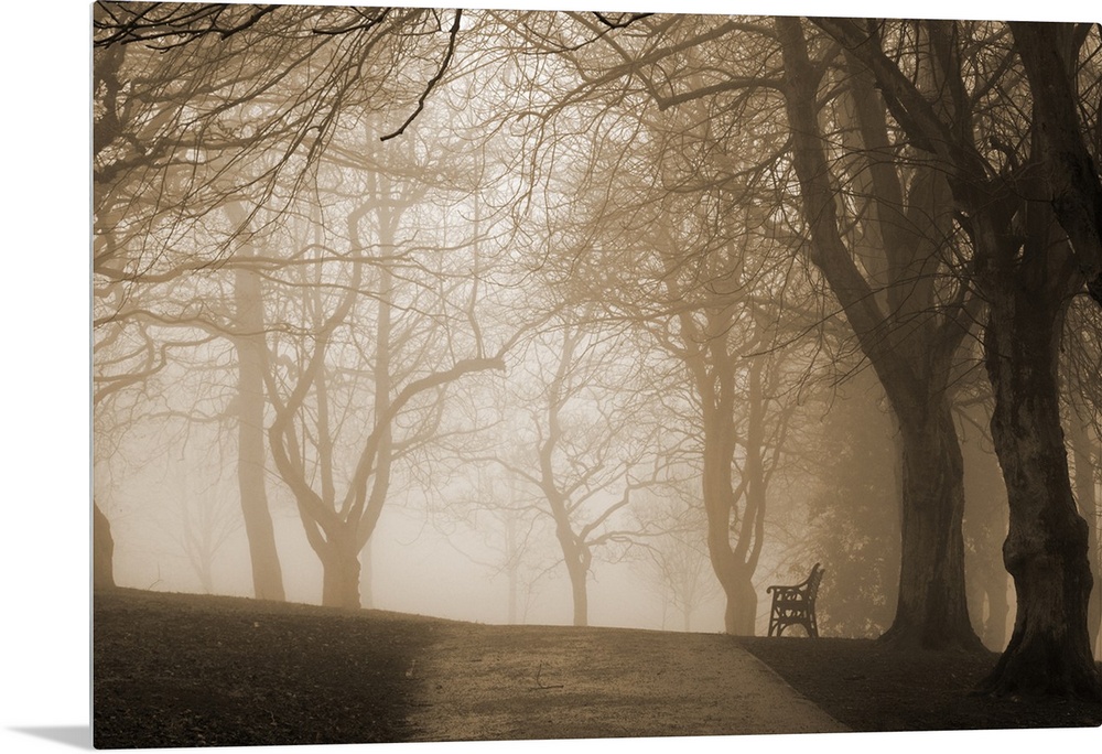 <p>A lone park bench on a foggy day in the park</p>