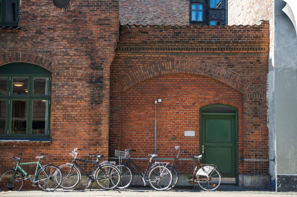 <p>Parked Bicycles Near Brick Wall Of Building Of Copenhagen, Denmark</p>