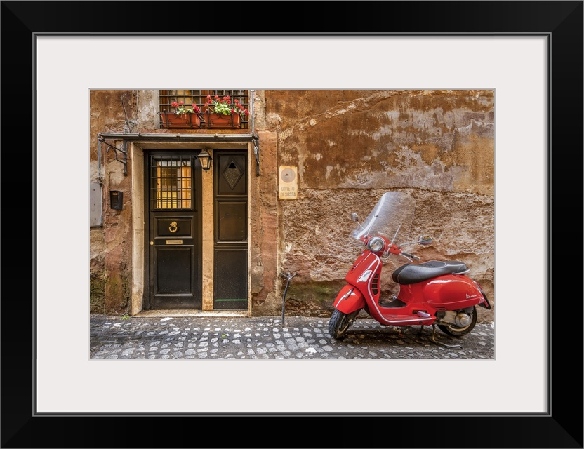 <p>Parked red Vespa scooter in a cobbled street of Rome, Lazio, Italy</p>