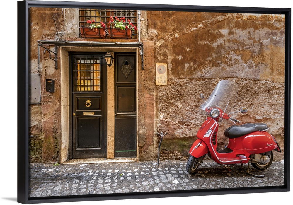 <p>Parked red Vespa scooter in a cobbled street of Rome, Lazio, Italy</p>