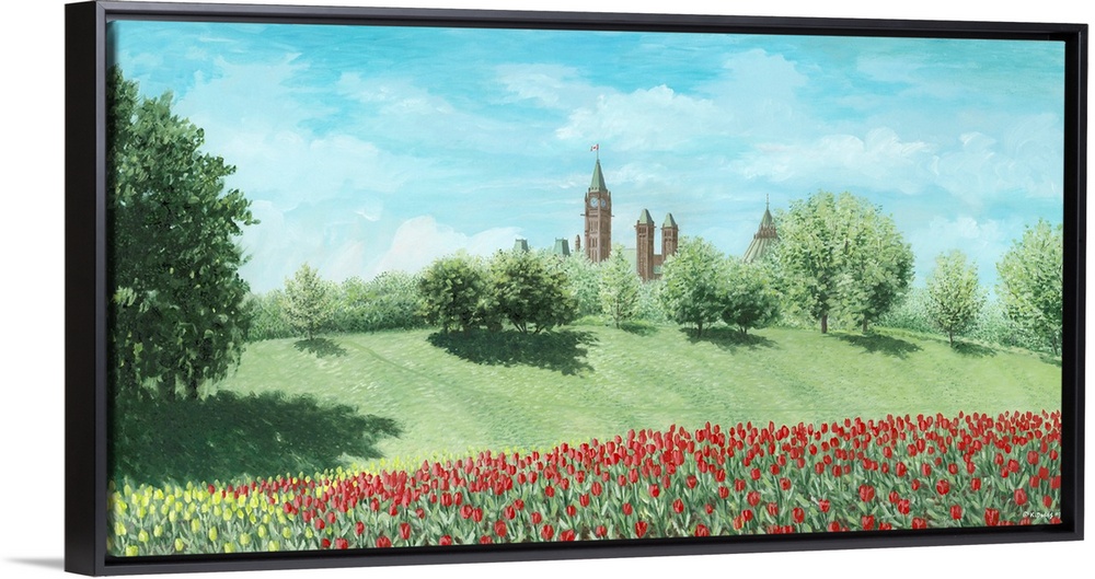 <p>Contemporary artwork of a field of tulips with buildings in the distance.</p>