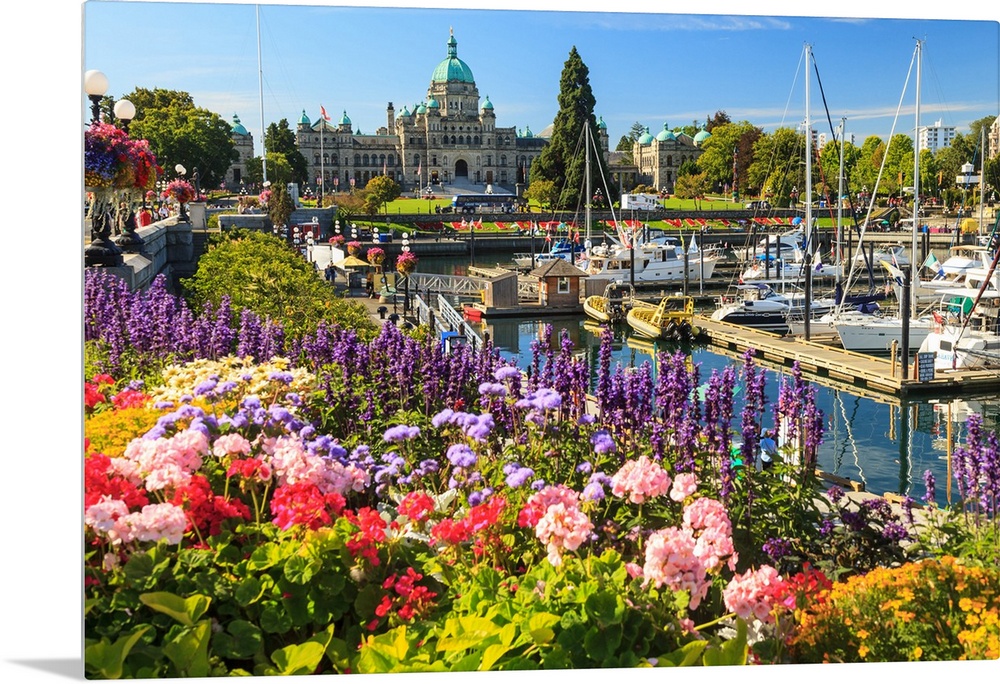 <p>Summer flowers at Inner Harbour, Parliament Buildings behind, Victoria, Capital of British Columbia, Canada</p>