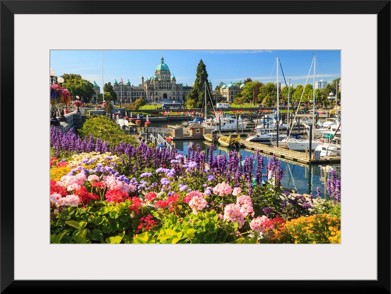 <p>Summer flowers at Inner Harbour, Parliament Buildings behind, Victoria, Capital of British Columbia, Canada</p>