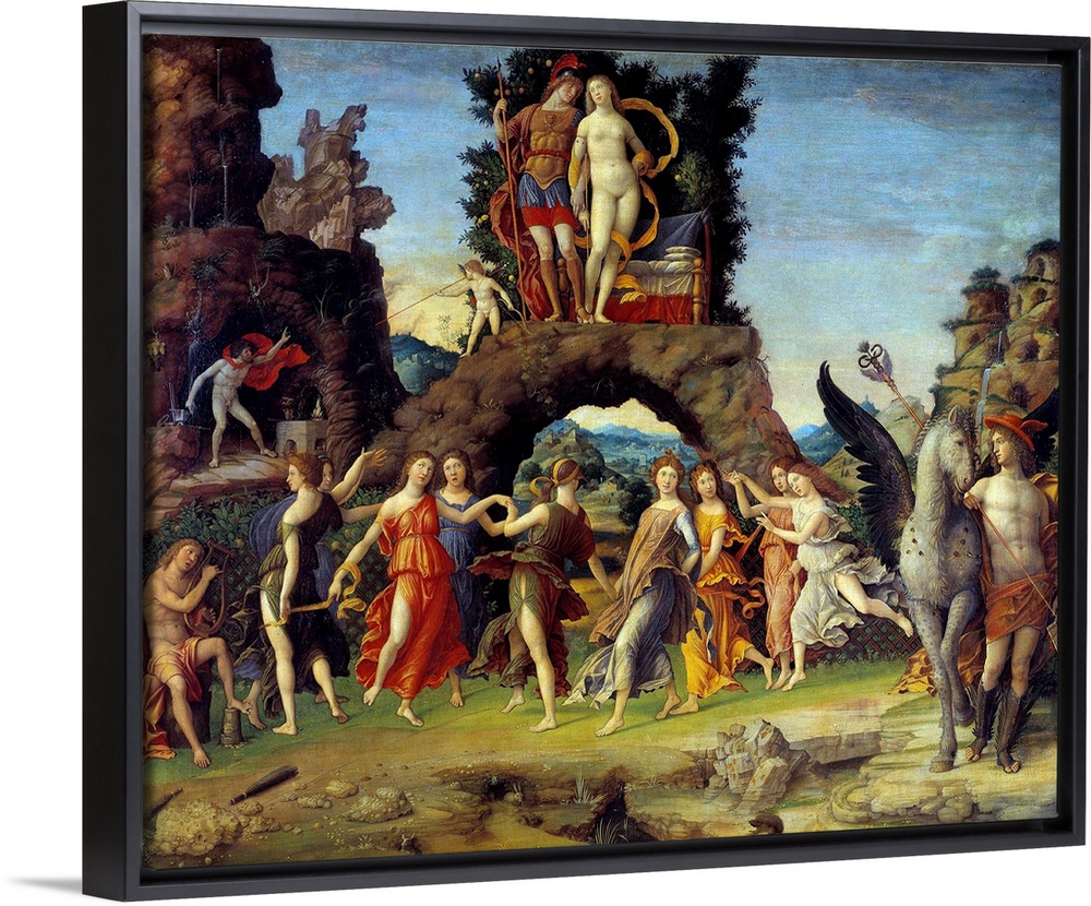 <p>Mars and Venus or Parnassus. Painting representing Mars and Venus on a rock, Pegasus and Mercury, Apollo and the nine Muses : Calliope (epic poetry), Clio (history), Erato (lyric art), Euterpe (music), Melpomene (tragedy), Polyhymnia (rhetoric), Terpsichore (dance), Thalia (pastoral poetry), Urania (astrology, astronomy). Painting by Andrea Mantegna (1431-1506), 1497. 1,59 x1, 92 m. Louvre Museum, Paris</p>