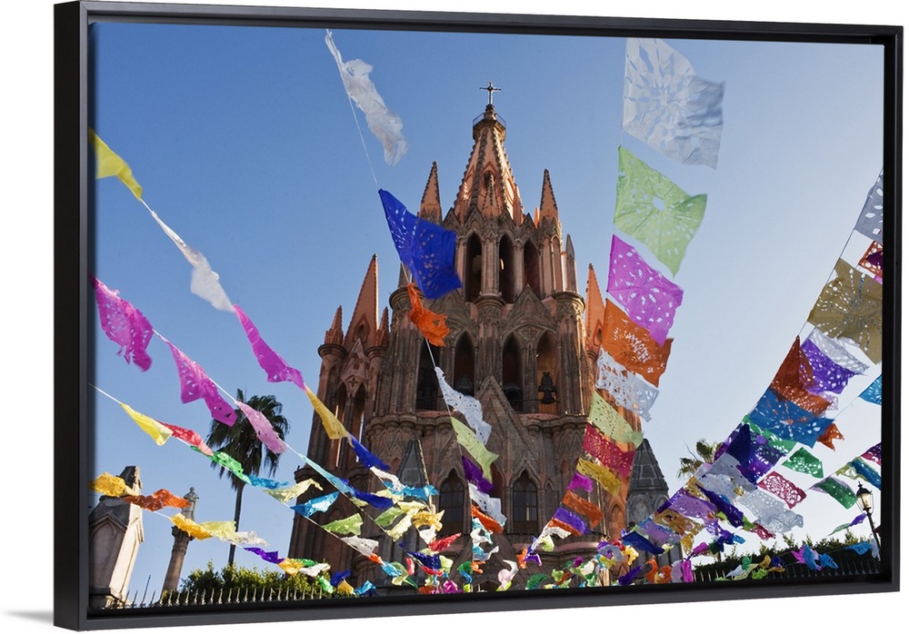 <p>Mexico, Guanajuato, San Miguel de Allende, Parroquia De San Miguel Archangel Church Tower with Day of the Dead Banners.</p>