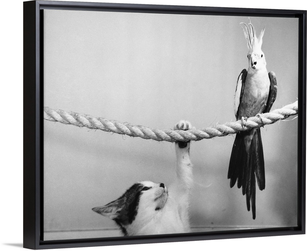 <p>Puss reaches high to try to get up there where Mr Parrot sits so jauntily.</p>