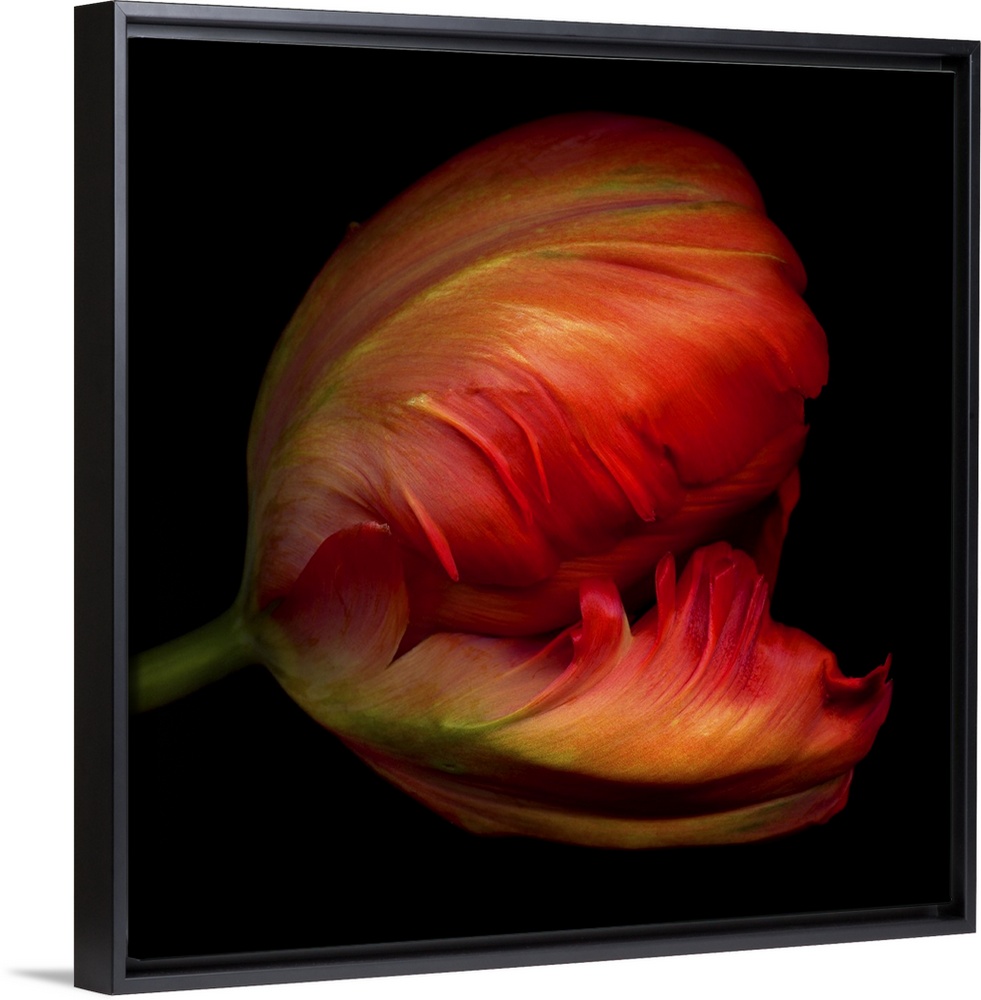 <p>Close-up side view of an exotic red parrot tulip.</p>