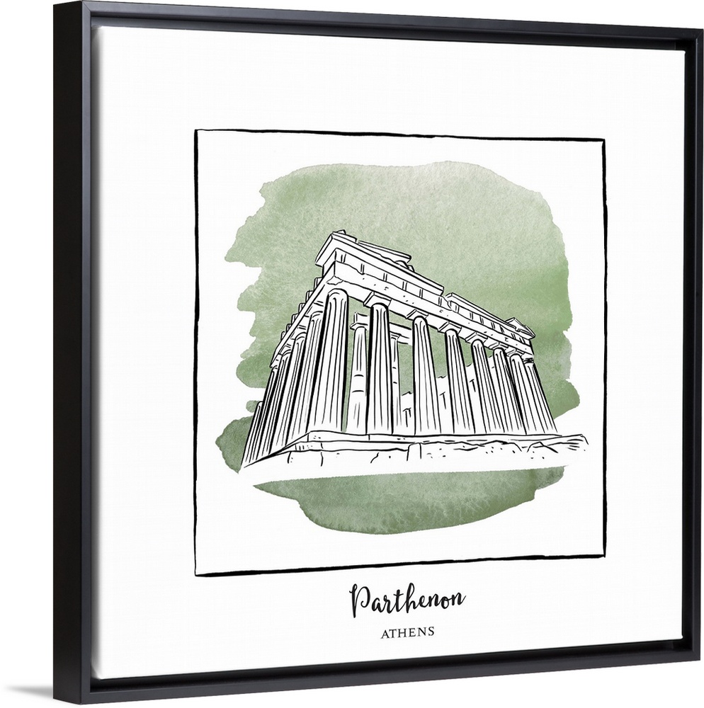 <p>An ink illustration of the Parthenon in Athens, Greece, with a green watercolor wash.</p>