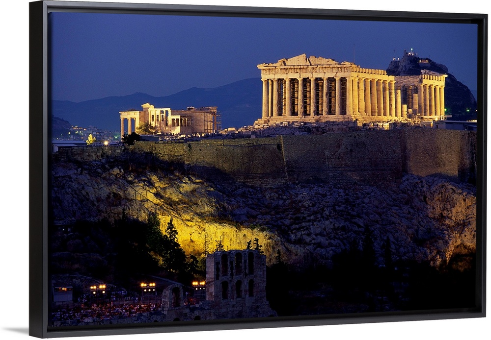 <p>The Parthenon and surrounding temples of the Acropolis sit illuminated, overlooking Athens.</p>