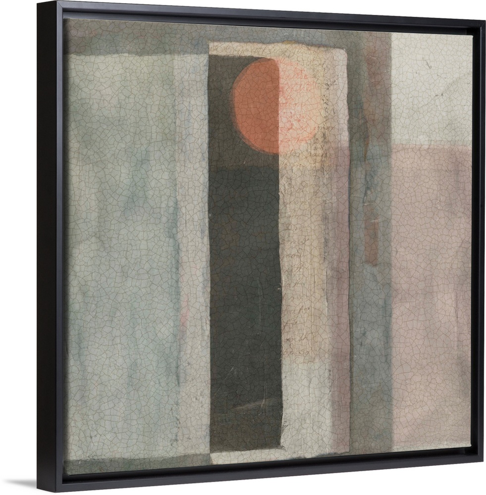 <p>This abstract artwork features overlapping rectangular shapes with a pink circle and is finished with a crackling texture.</p>