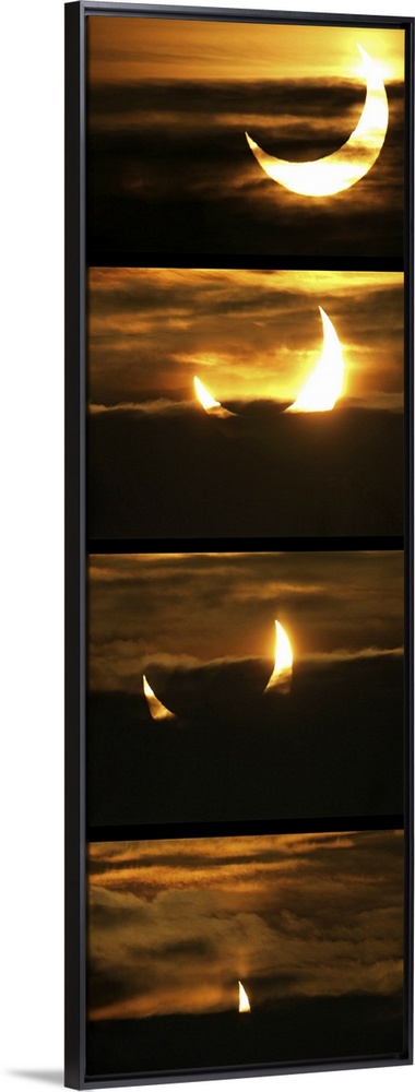 <p>Partial solar eclipse. Series of images showing the progression of a partial solar eclipse, as seen from Duisburg, Germany, on the morning of 4th January 2011. A partial solar eclipse occurs when the Moon only partially covers the disc of the Sun in the sky. The maximum coverage seen at this location was 70 percent at 9.15 AM (8.15 GMT). The next visible solar eclipse for this location will be in 2015.</p>