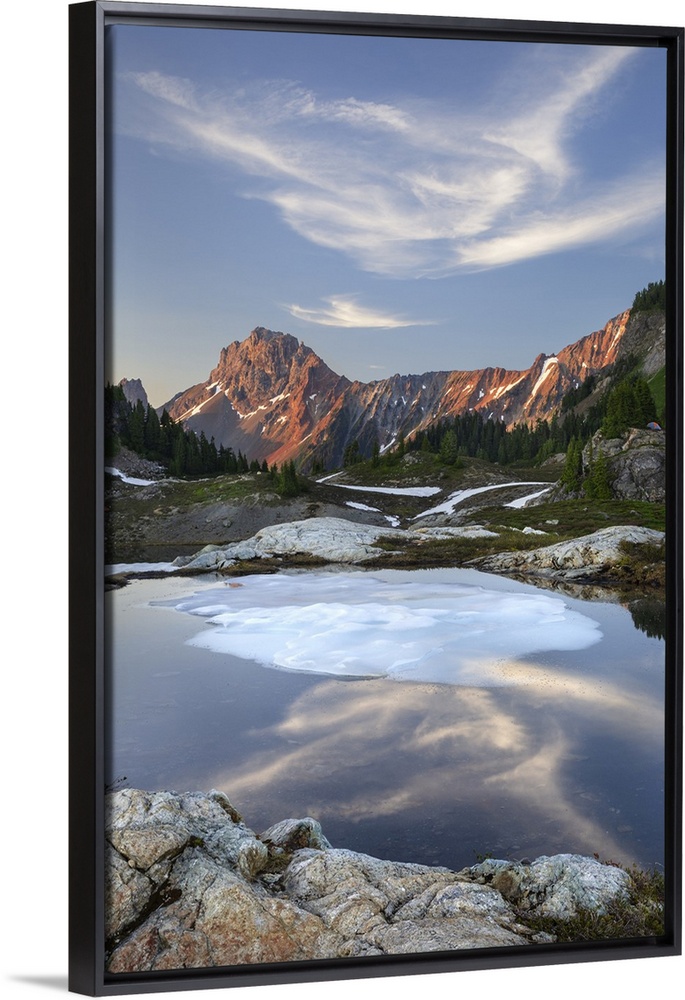 <p>Partially thawed tarn, Yellow Aster Butte Basin. American Border Peak and Yellow Aster Butte in the distance. Mount Baker Wilderness, North Cascades, Washington State</p>