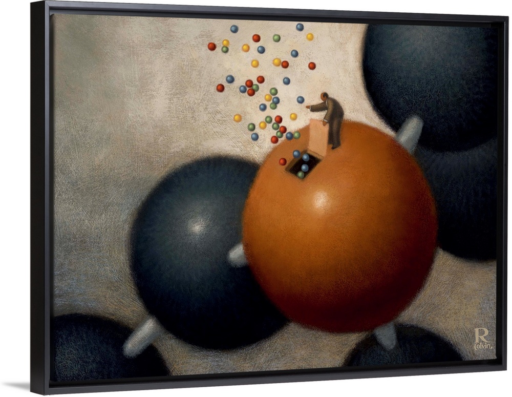 <p>Conceptual painting of a small man opening a door on a molecule letting out more particles.</p>
