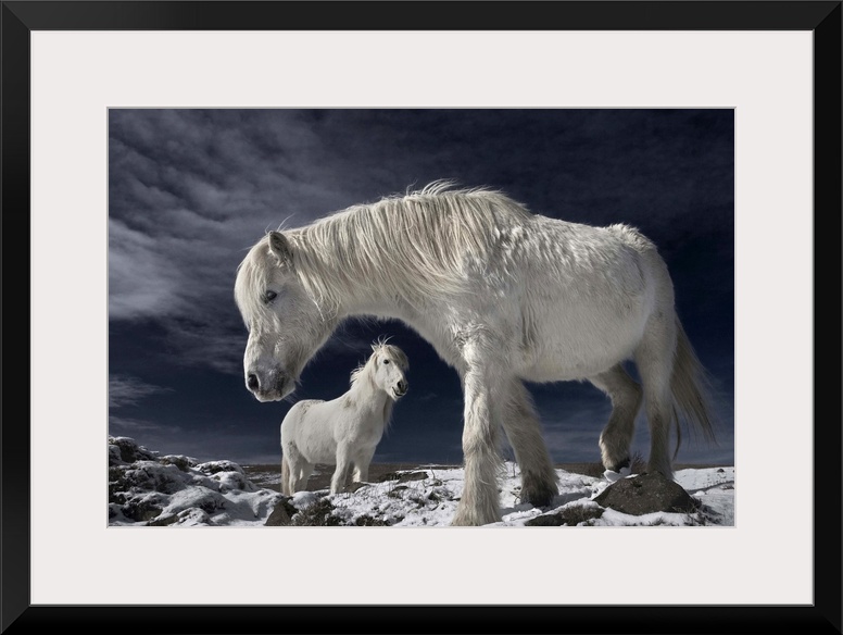 <p>Two white Icelandic horses standing in a snowy field.</p>