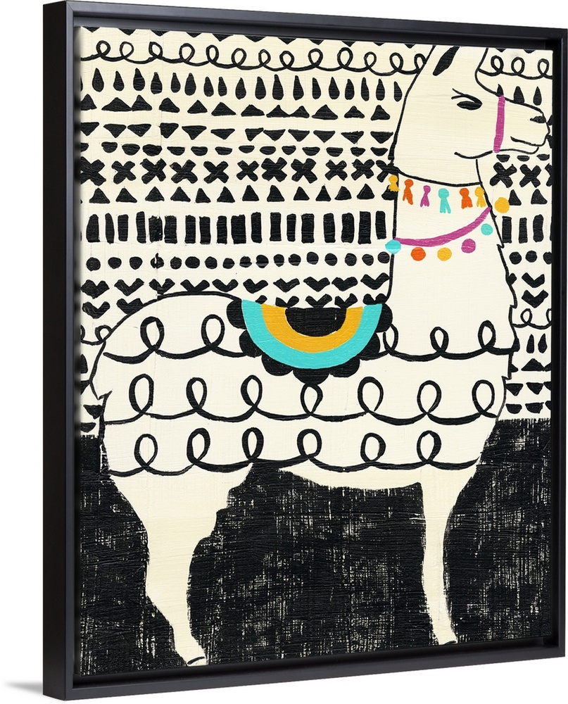 <p>Whimsical painting of a llama in black and white wearing colorful party decorations.</p>