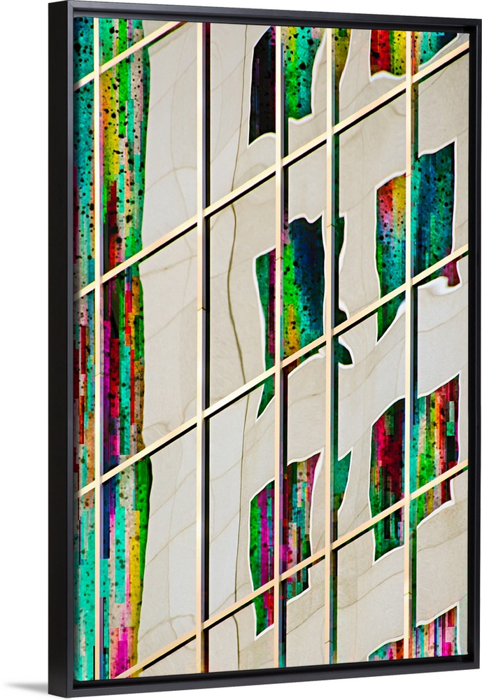 <p>Abstract photograph of a warped image of colorful windows, reflected in the side of a skyscraper.</p>