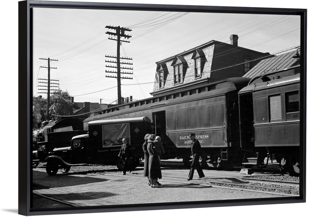 <p>Passengers arriving at the railroad station in Hagerstown, Maryland. Photograph by Arthur Rothstein, 1937.</p>