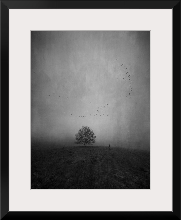 <p>Silhouettes of two persons walking away from each other and a lonely tree in a strange and further empty landscape</p>