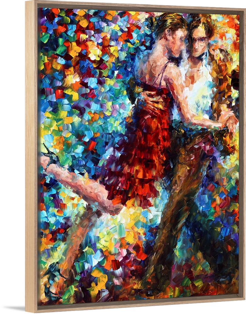 <p>Contemporary painting of a couple dancing. The image consists of small color daubs of paint.</p>