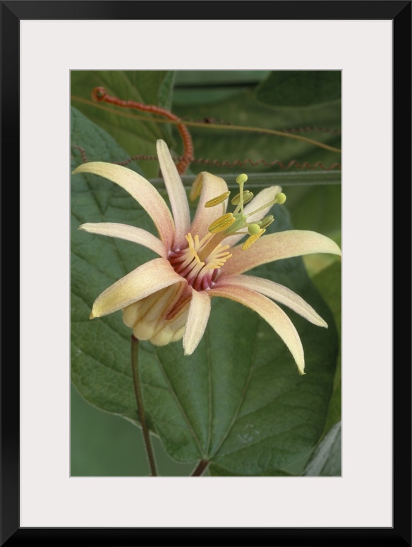 <p>Passion flower (Passiflora 'Adularia'). The passion flower is a tropical climbing plant that is native to South America. The flower consists of petals and sepals surrounding yellow corona filaments. In the centre are the reproductive parts of the plant. The male parts are at the bottom, with the female parts on top. There are five male stamens, which consist of a stalk-like filament and a pollen-bearing anther. Above these is the green round ovary, which is topped by three styles, which all end in a stigma.</p>
