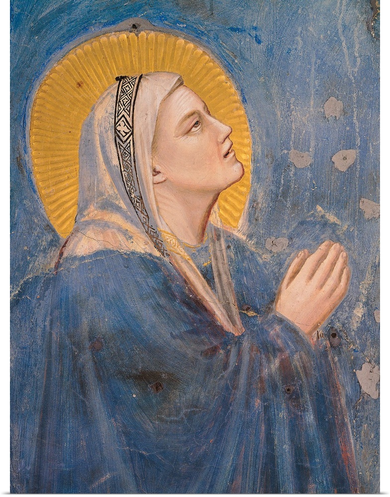 <p>Stories of the Passion The Ascension, by Giotto, 1304 - 1306 about, 14th Century, fresco, - Italy, Veneto, Padua, Scrovegni Chapel. Stories of the Passion the Ascension. Detail the face of the Virgin Mary Madonna aureole halo veil white blue gold light bl</p>