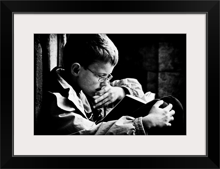 <p>A young boy with glasses reads a book on his lap, Belgium.</p>