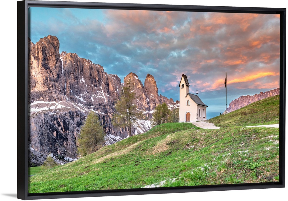 <p>Passo Gardena, Dolomites, South Tyrol, Italy. Passo Gardena, Dolomites, South Tyrol, Italy. Chapel on the Gardena pass at sunrise.</p>